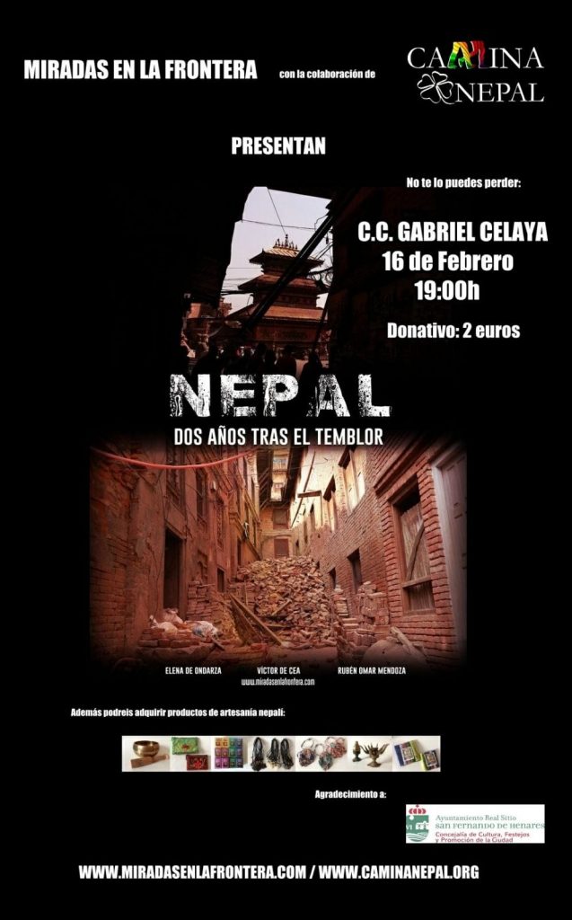 Miradas en la Frontera presenta este viernes 16 de febrero su reportaje documental «Nepal: Dos años tras el temblor» a las 19:00 en el Centro Cultural Gabriel Celaya de San Fernando de Henares (Madrid).